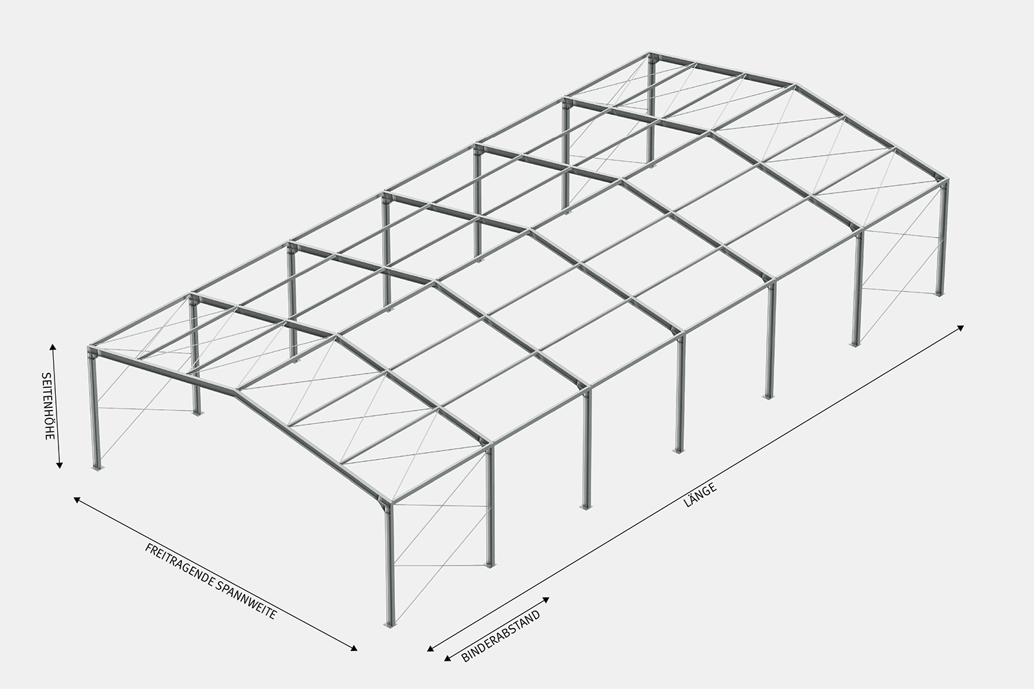 Bei der Größe Ihrer Stahlhalle haben Sie keine Einschränkungen. Jede Halle wird individuell nach Kundenwunsch gefertigt. Wir können freitragende Spannweiten bis 30 m und Seitenhöhen bis 10 m realisieren. Spannweiten über 30 m können durch mehrschiffige Bauweise erreicht werden. Bei der Länge haben Sie die freie Wahl, üblich sind Binderabstände von 4, 5 oder 6 m.